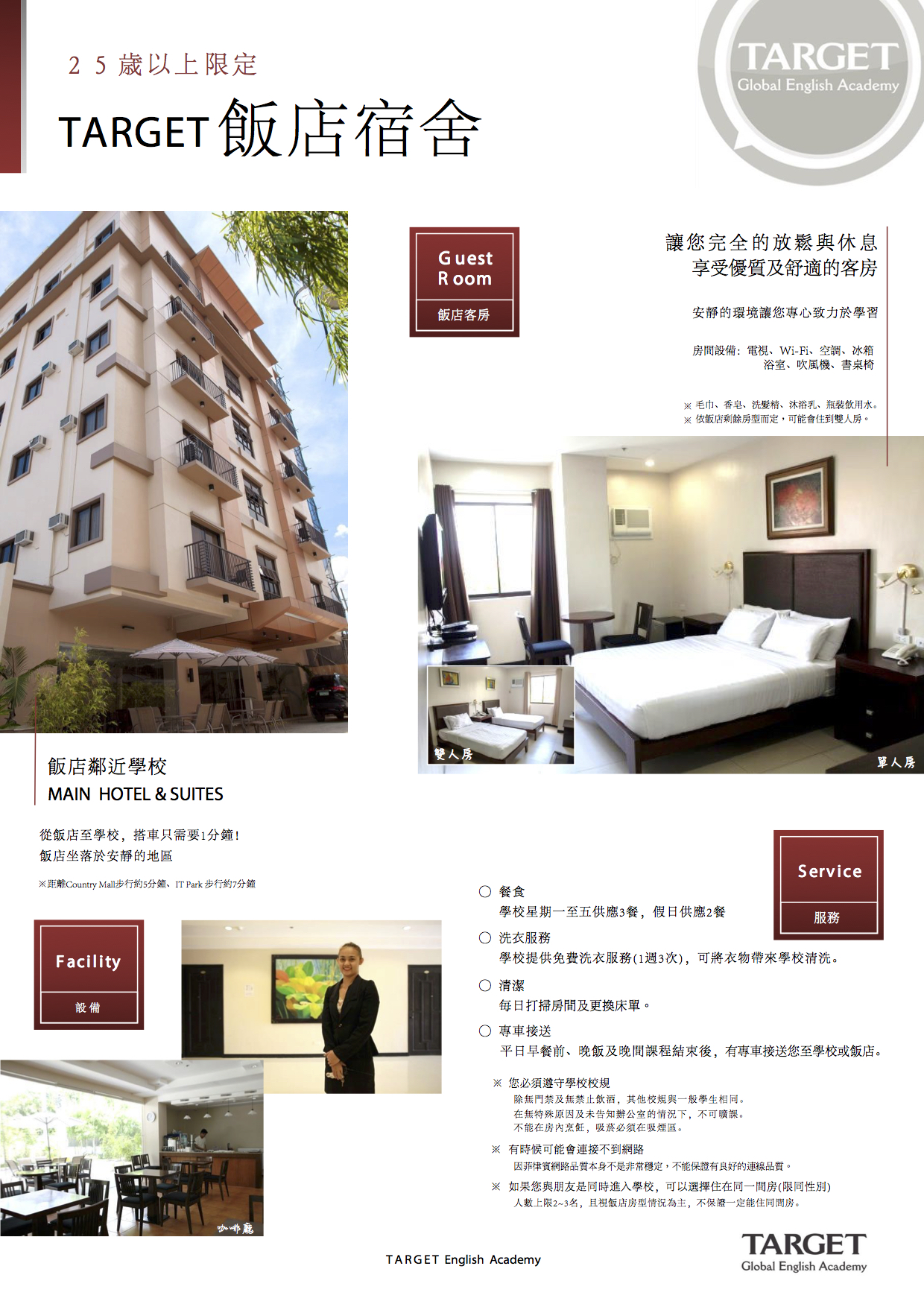 ホーム 資料下載 宣傳資料 官方宣傳手冊這是最新的PDF手冊。如果您需要冊子版本,請聯繫台灣經理。2020價目表這是最新的價目表,還列出了當地費用及Visa費用。照片以上為我校基本照片,請下載您需要的照片。 校外酒店宿舍校外酒店宿舍的宣傳資料校外公寓宿舍校外公寓宿舍的宣傳資料校內六人房的資料校內六人房的宣傳資料 雅思課程課程內容大綱與保證班課程日期。學生行前手冊請在學生出發之前提供給學生電子檔案或交付打印文件。 申請表 報名表它是Excel格式的申請表。點擊即可自動下載。18歲以下外出許可申請表如果您想外出,您必須提前向父母提交申請表。請下載並使用。